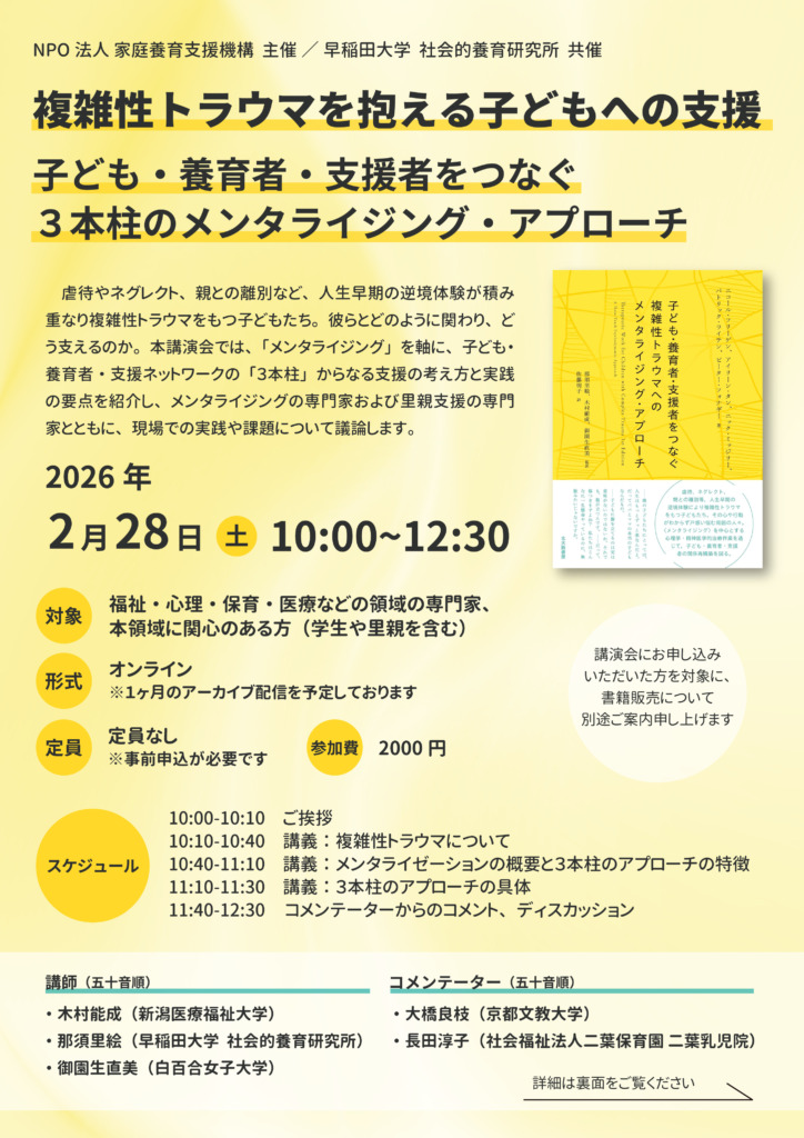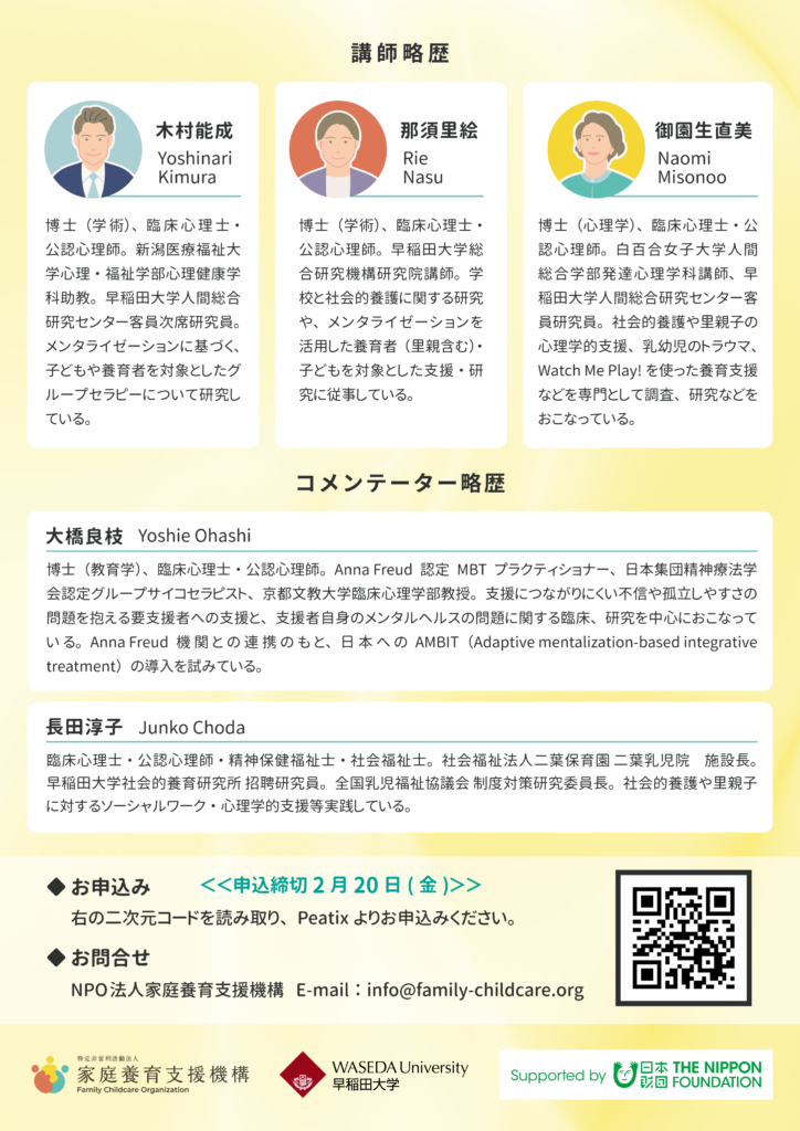 対象 : 福祉・心理・保育・医療などの領域の専門家、本領域に関心のある方(学生や里親を含む)