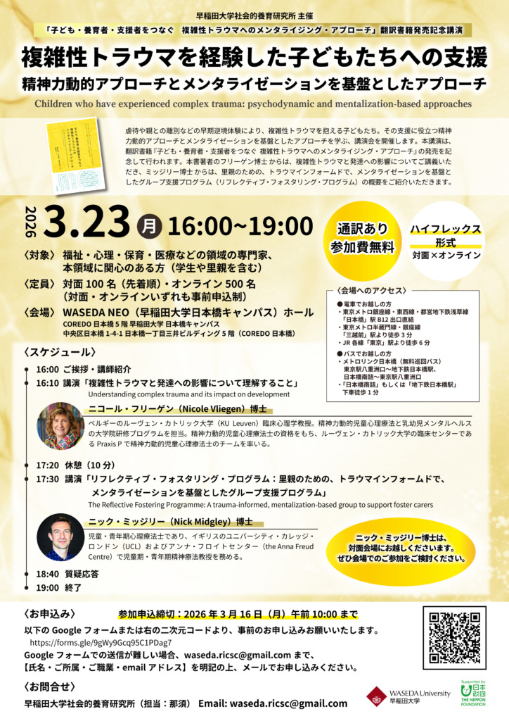 「子ども・養育者・支援者をつなぐ 複雑性トラウマへのメンタライジング・アプローチ」翻訳書籍発売記念講演